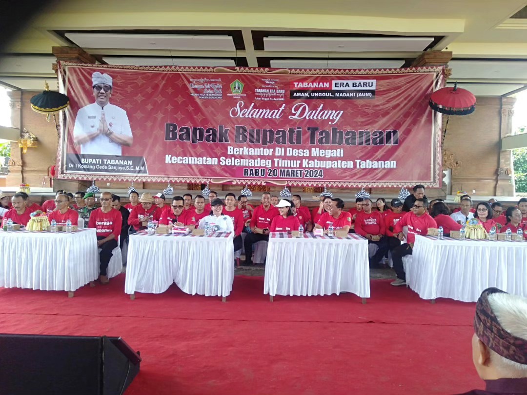 Bupati Tabanan, Dr. I Komang Gede Sanjaya, M.M., didampingi oleh Ketua TP PKK Kabupaten Tabanan, Ny. Rai Wahyuni Sanjaya, melaksanakan program Bungan Desa (Bupati Ngantor di Desa) yang ke-46 di Desa Megati, Kecamatan Selemadeg Timur, pada hari Rabu, 20 Maret 2024.